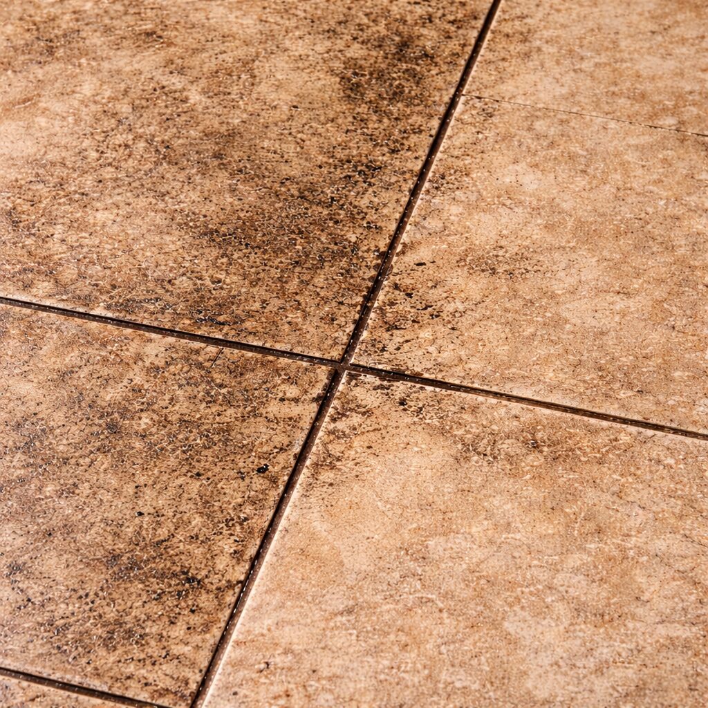 High-traffic paths show darker grout first. Even daily cleaning may not reverse embedded buildup.