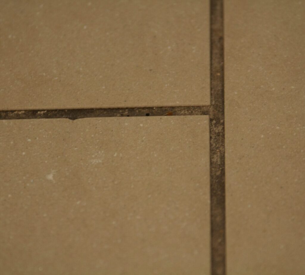 This leaves dirty grout lines that look uneven. Some areas appear darker due to trapped debris.